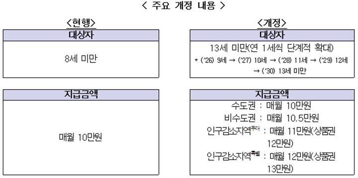 이번 개정안에 따라 현재 8세 미만 아동에게 월 10만 원을 지급하는 제도는 2030년까지 13세 미만으로 단계적으로 확대된다. 2025년부터 매년 한 살씩 상향하는 방식이다. 또한, 연령 조정 과정에서 지급이 중단되는 사례를 방지하기 위해 2017년생 아동은 13세가 될 때까지 계속 지원하는 특례도 마련됐다.